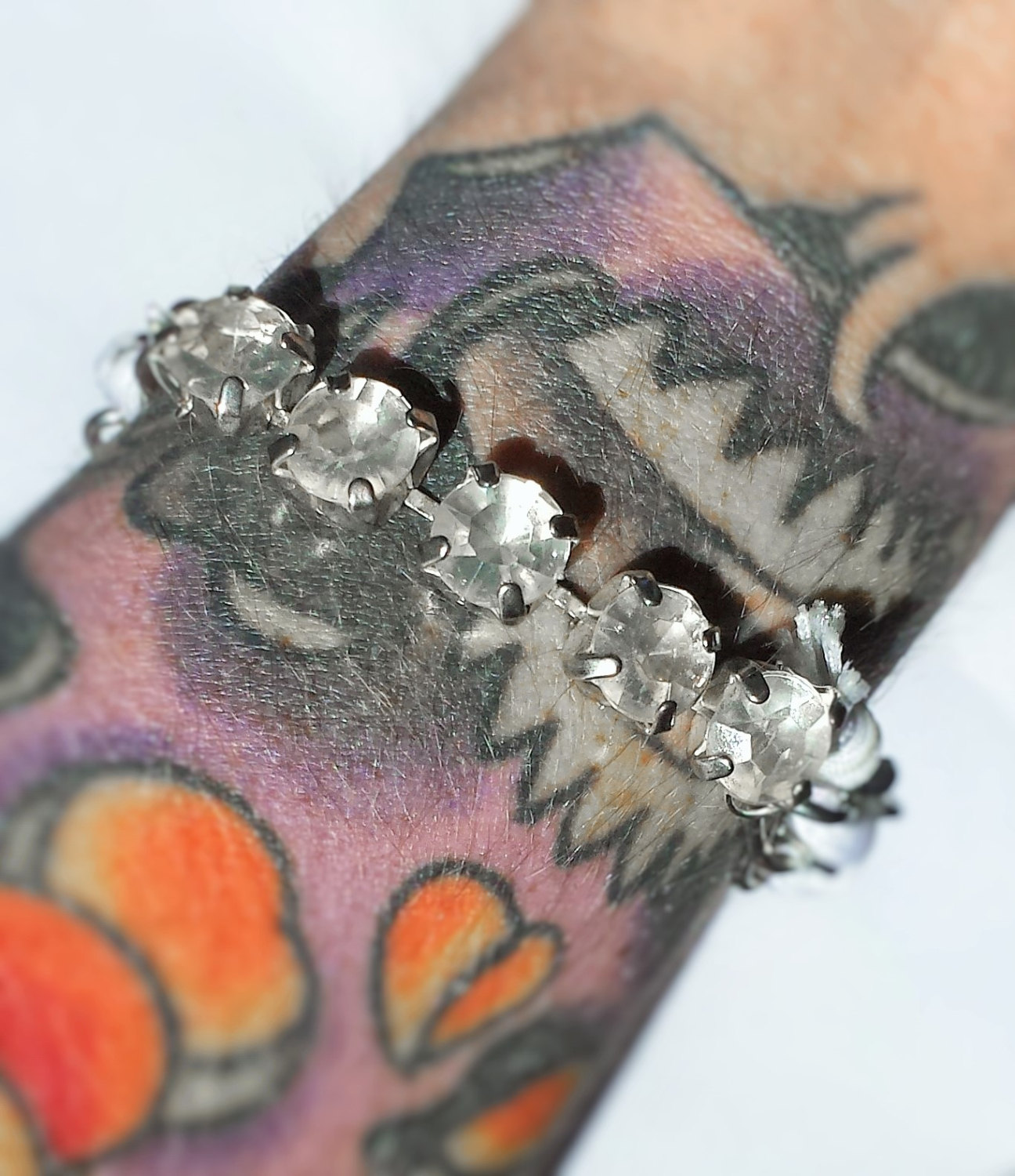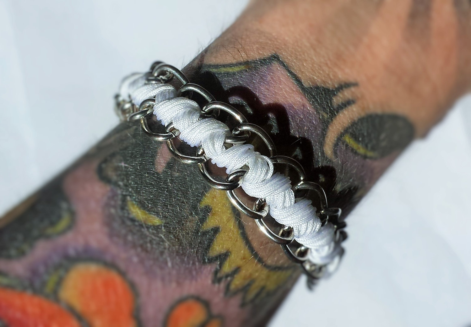 This one of a kind bracelet I made using 0.8mm white nylon knotting cord braiding two 13x9mm silver plated cable chains together, I accented the chain by adding a row of 10x10mm clear rhinestones in silver plated prong settings. I used a lobster clasp for the closure.