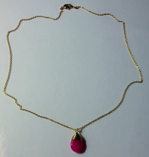 This pretty necklace is made with a 18" long very pretty and dainty gold plated brass, tarnish resistant 2 x 1.8mm cable chain, hanging from the chain is a gold plated brass looping wire fuchsia coloured jade teardrop that measures 9 x 17mm and is also tarnish resistant.