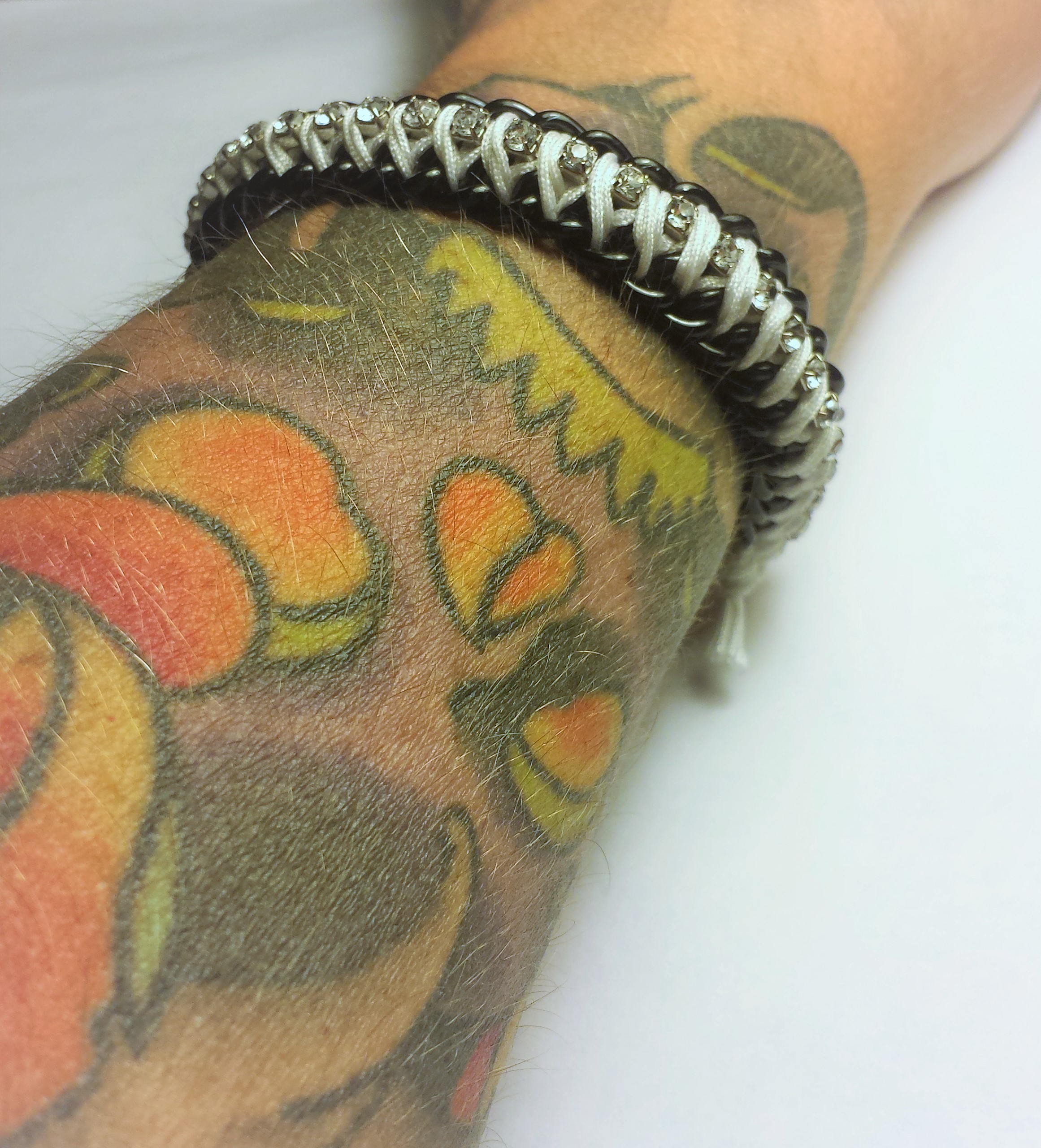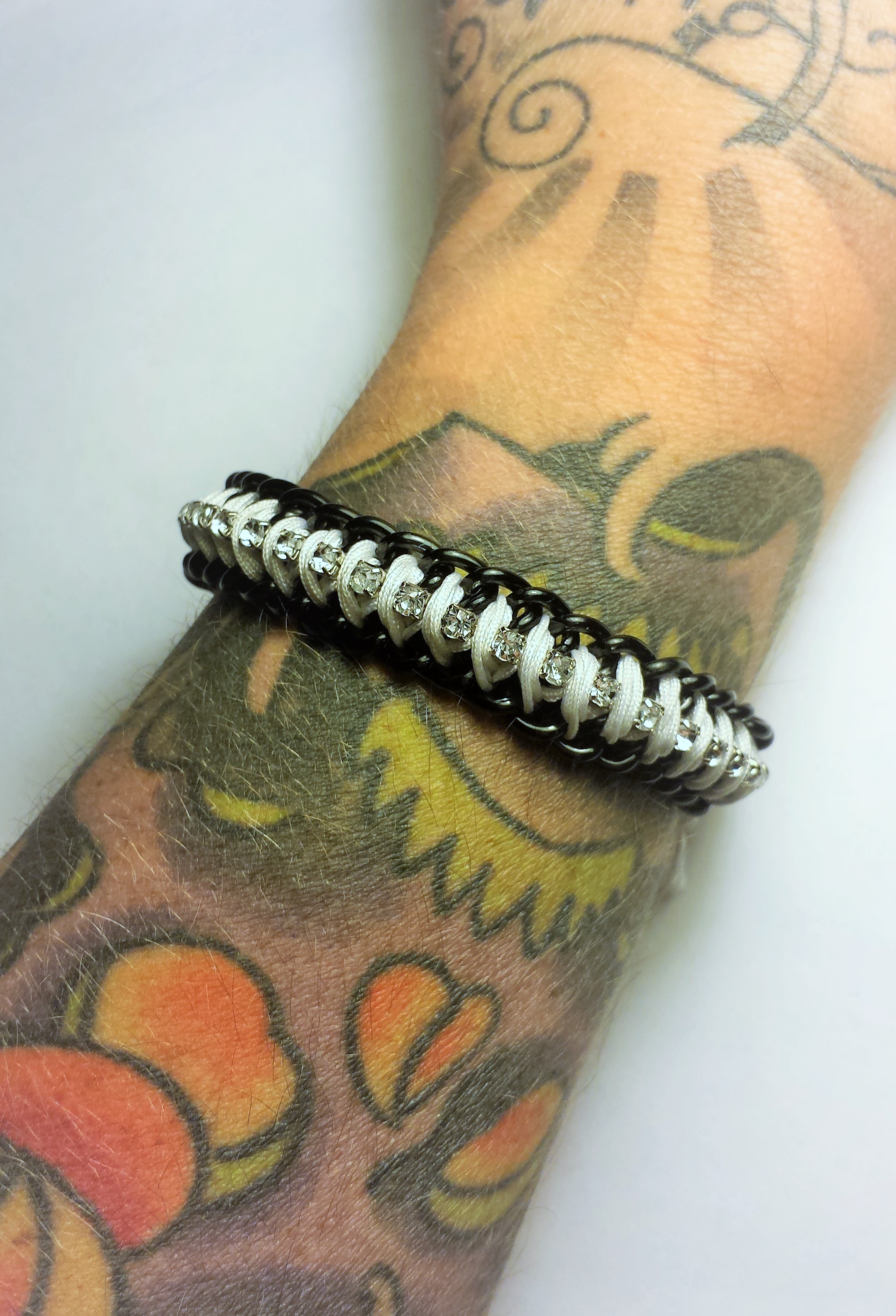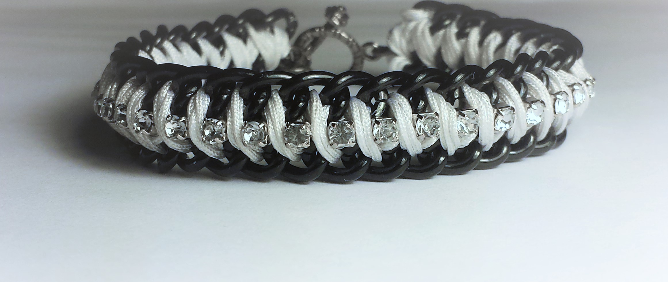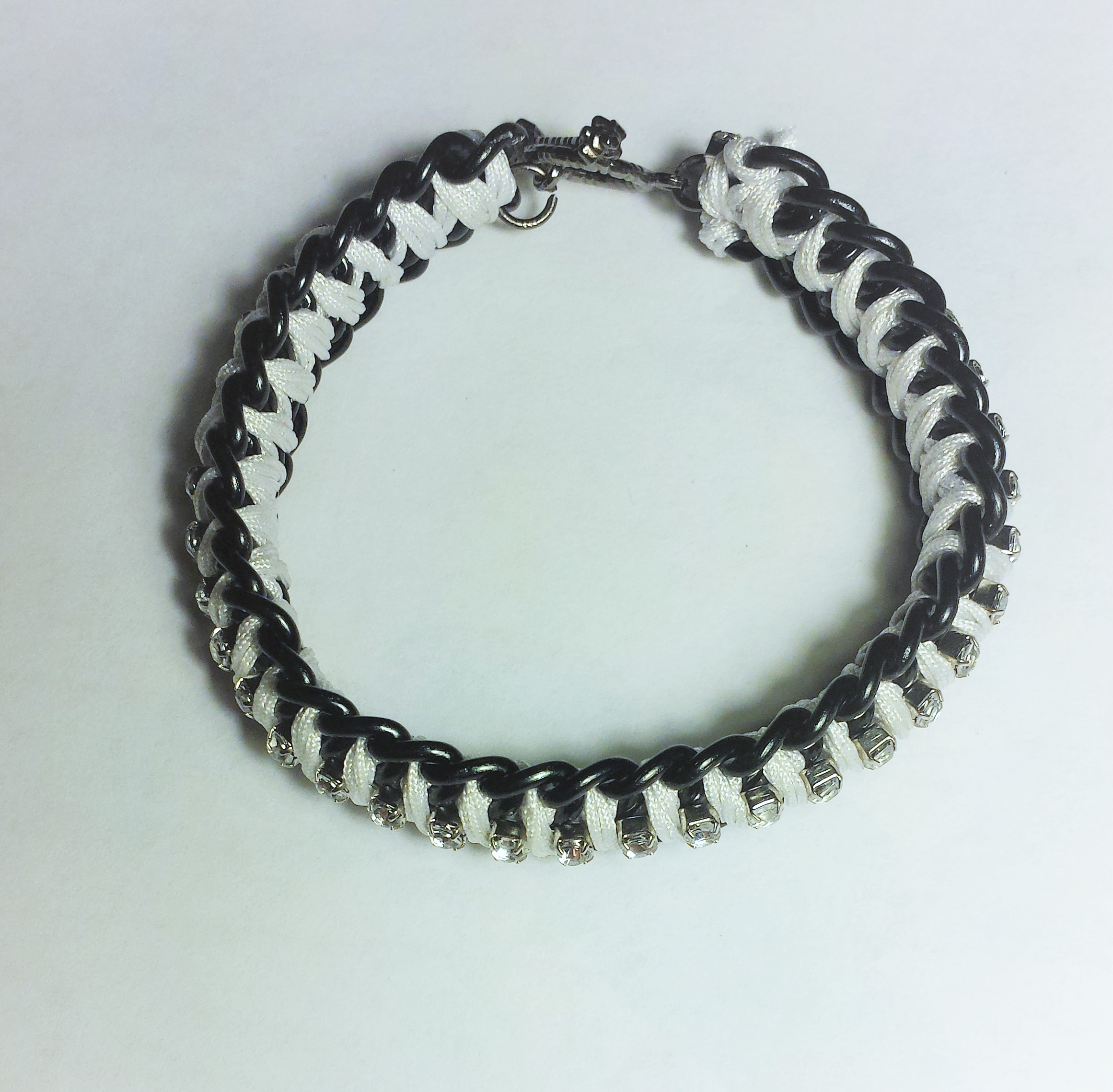 I made this bracelet with two rows of 7x8mm black plated curb chain braided together with 0.8mm white nylon knotting cord, featuring a chain of 3mm clear rhinestones down the centre. A toggle clasp for closure.